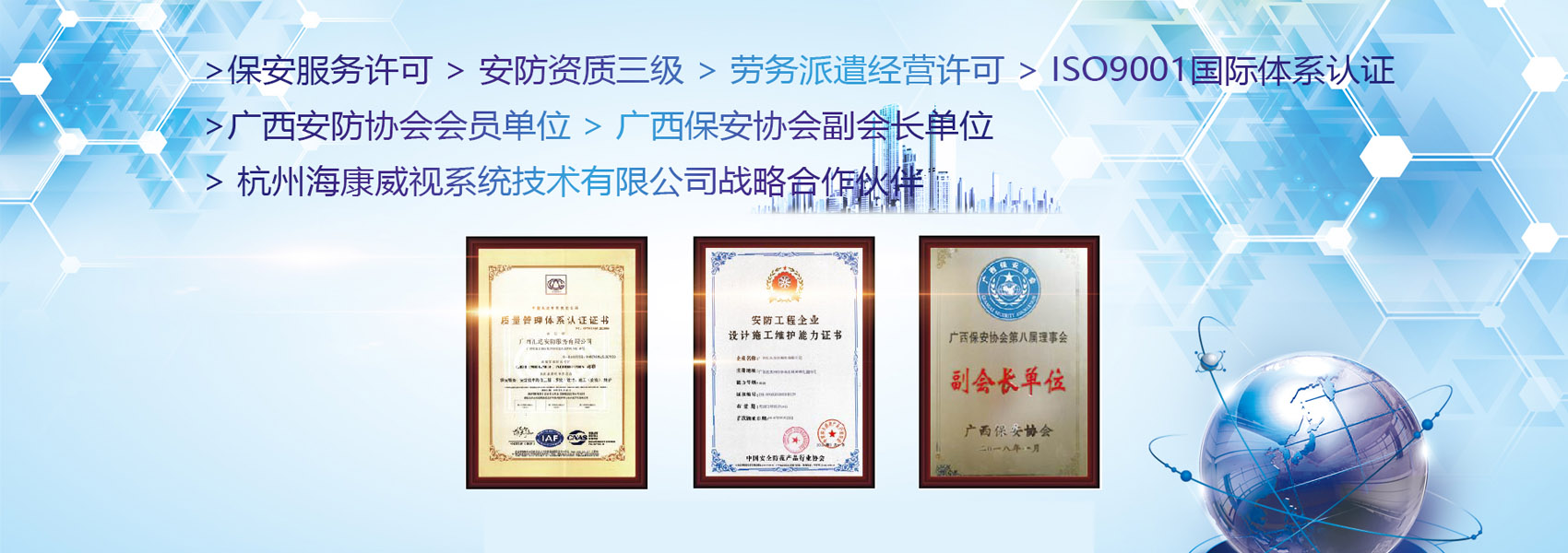 公司業(yè)務(wù)涉及安全技術(shù)防范工程設(shè)計(jì)、安裝、維護(hù),聯(lián)網(wǎng)報(bào)警服務(wù)、視頻監(jiān)控服務(wù)、保安服務(wù)、物業(yè)管理服務(wù)、建筑智能化工程、辦公自動(dòng)化、系統(tǒng)集成等業(yè)務(wù)。公司現(xiàn)具備“保安服務(wù)許可”、“安防資質(zhì)三級(jí)”、“勞務(wù)派遣經(jīng)營(yíng)許可”等資質(zhì),公司是廣西保安協(xié)會(huì)副會(huì)長(zhǎng)單位、廣西安防協(xié)會(huì)會(huì)員單位,是杭州??低曄到y(tǒng)技術(shù)有限公司戰(zhàn)略合作伙伴。